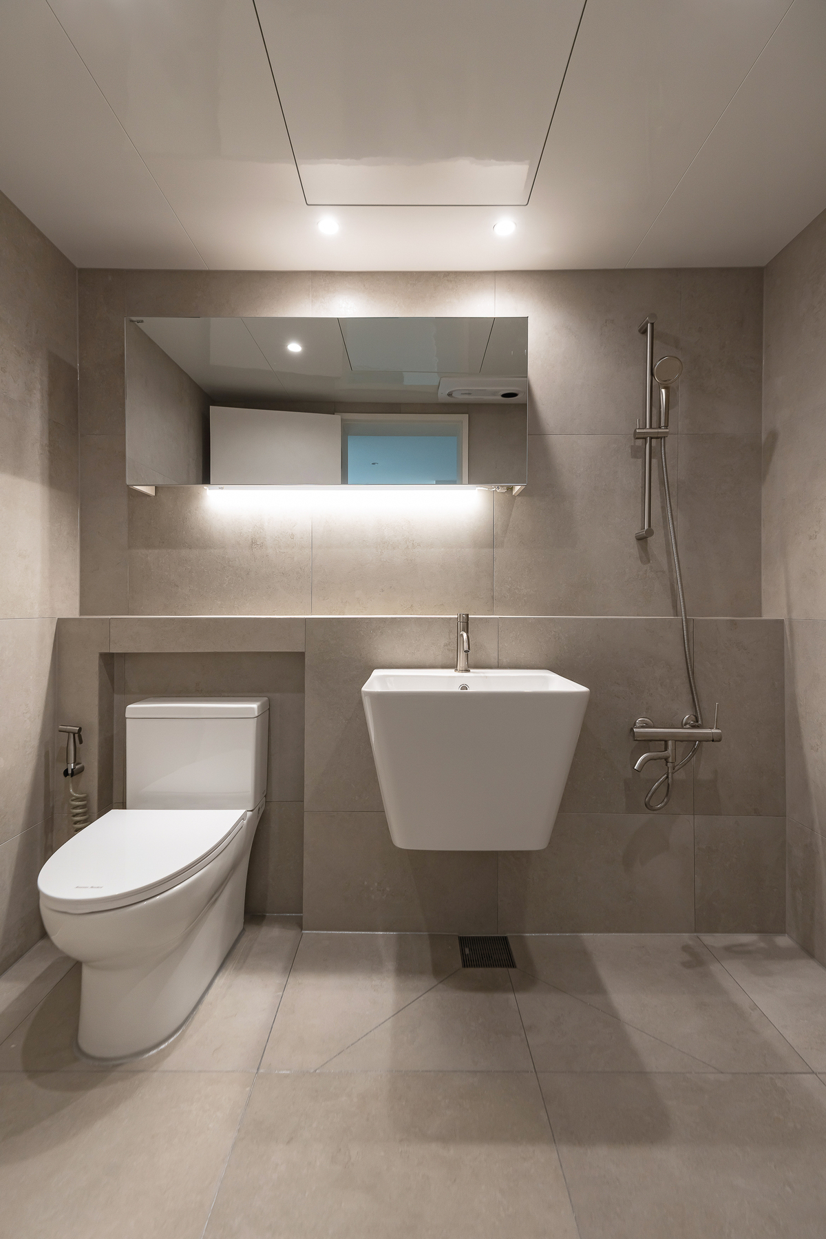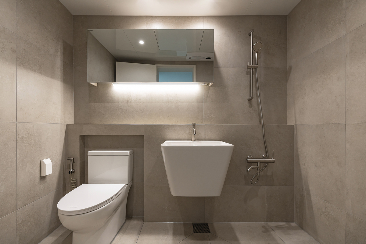 세면대는 벽걸이 형태로 시공해 바닥 공간을 확보하고 청소 편의성을 높였습니다.