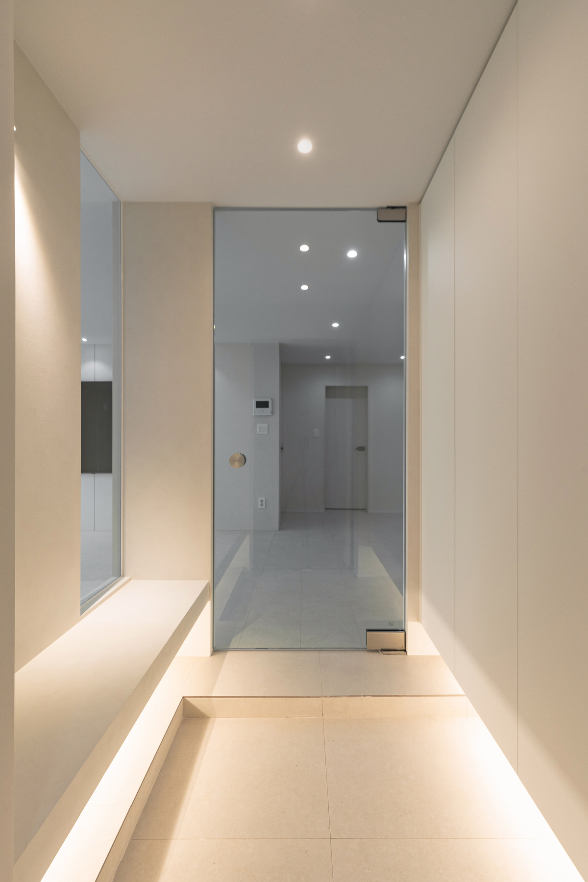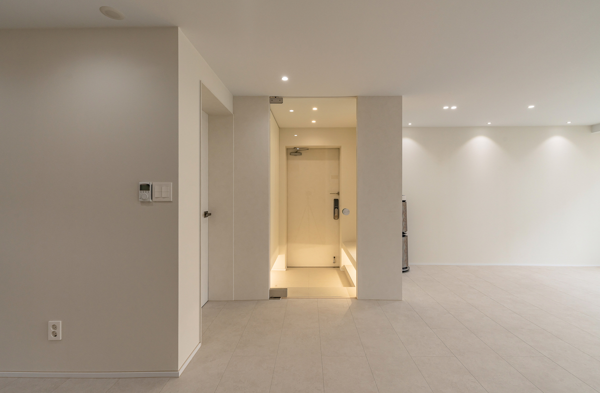 이번 현관은 유리 중문을 적용해 공간을 분리하면서도 시야는 열어두는 방식으로 설계했습니다