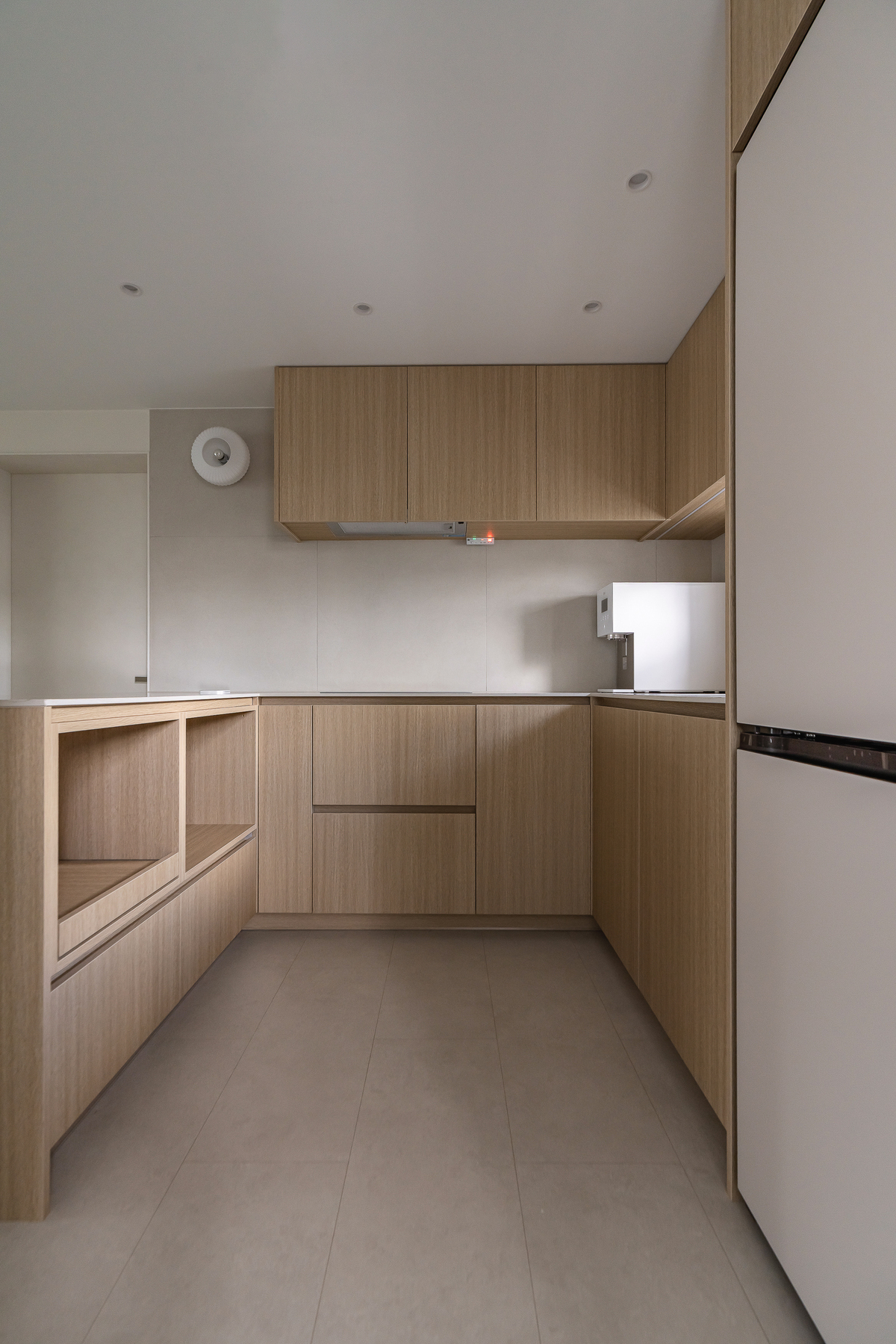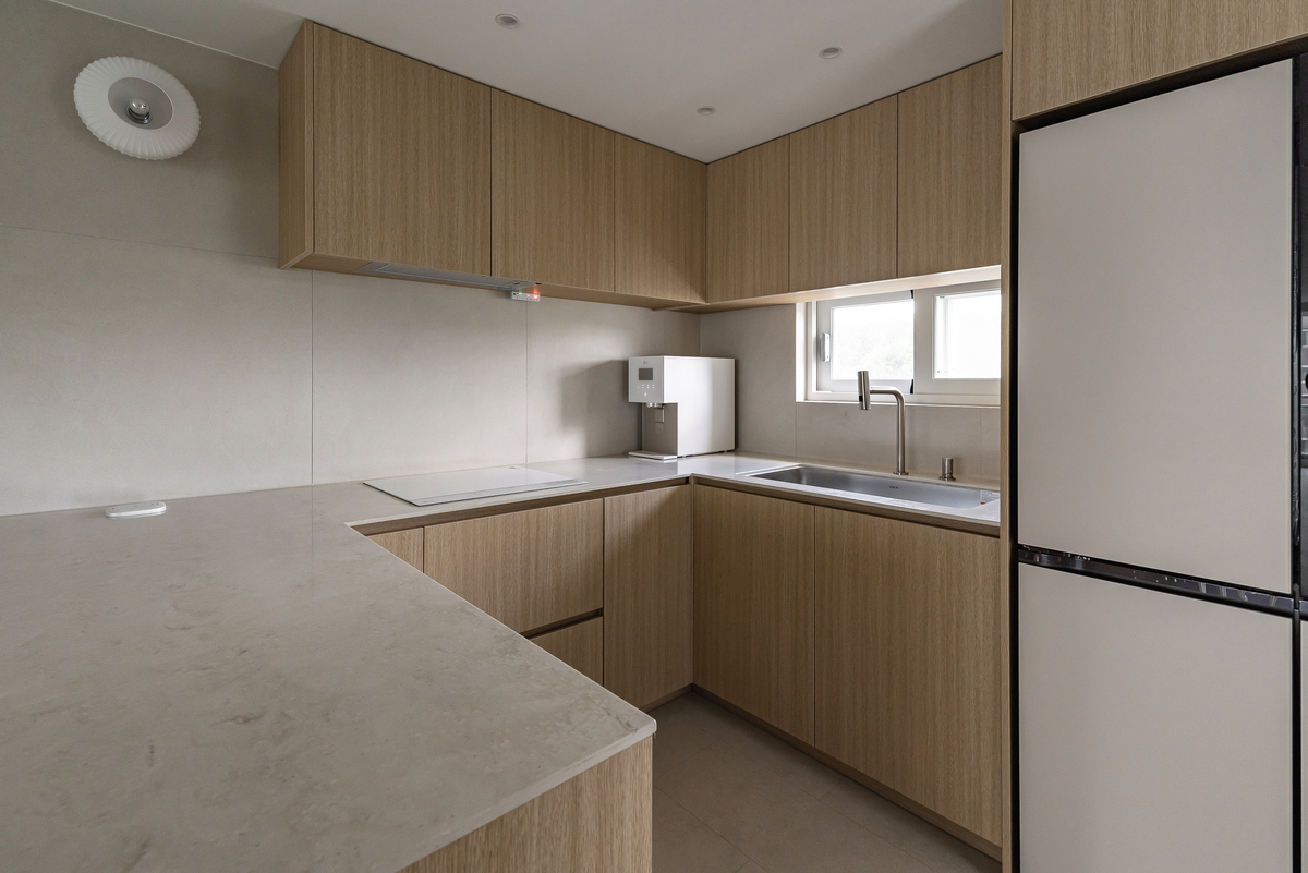 구조는 ㄱ자 형태에 아일랜드를 더해 작업 흐름이 자연스럽게 이어지도록 구성했습니다.