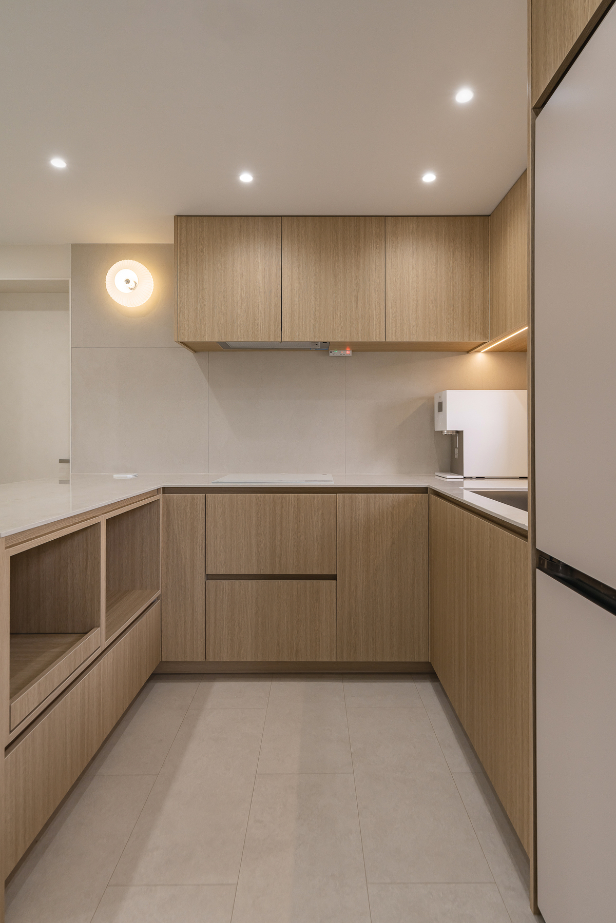상부장은 최소화해 답답함을 줄이고, 하부장은 우드톤을 적용해 따뜻한 분위기를 더했습니다.